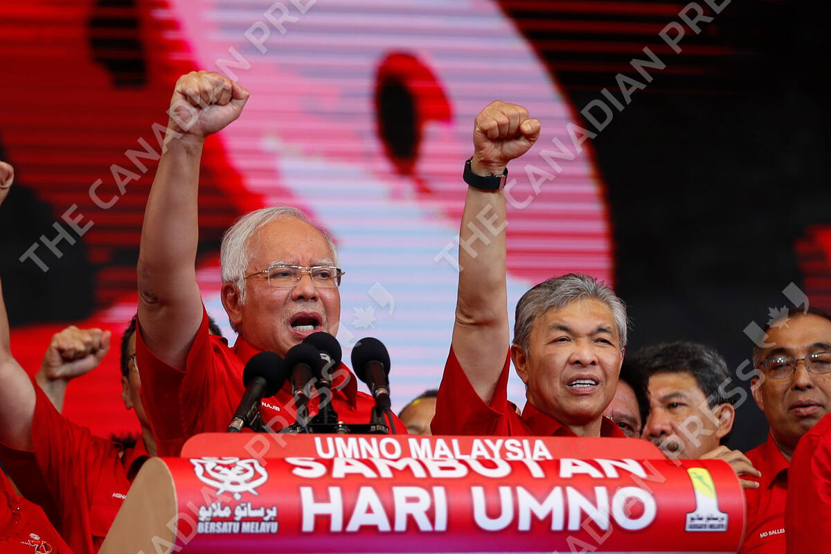 FILE - Malaysian Prime Minister and President of Malaysia's ruling party United Malays National Organization's (UMNO) Najib Razak, left, and Deputy Prime Minister Ahmad Zahid Hamidi chant a slogan during a celebration of party's 71st anniversary in Kuala Lumpur, Malaysia, May 11, 2017. Najib Razak on Tuesday, Aug. 23, 2022 was Malaysia’s first former prime minister to go to prison -- a mighty fall for a veteran British-educated politician whose father and uncle were the country’s second and third prime ministers, respectively. The 1MDB financial scandal that brought him down was not just a personal blow but shook the stranglehold his United Malays National Organization party had over Malaysian politics. (AP Photo/Vincent Thian, File)