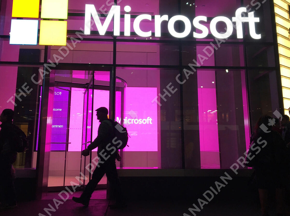 FILE - People walk past a Microsoft office on Nov. 10, 2016, in New York. Microsoft on Tuesday, July 26, 2022, reported fiscal fourth-quarter profit of $16.7 billion, or $2.23 per share, a rare disappointment from the tech giant that has consistently beat Wall Street expectations in recent years. (AP Photo/Swayne B. Hall, File)