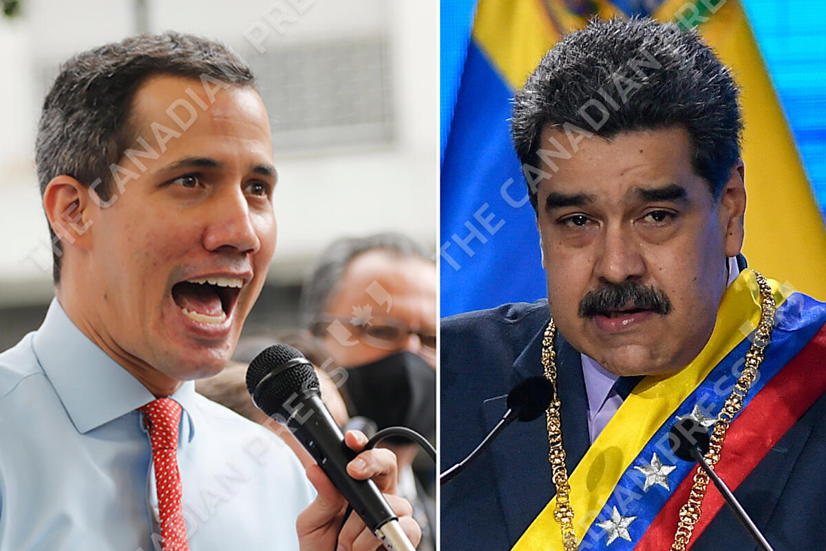 FILES - Juan Guaido, the leader of Venezuela's National Assembly who says he is also the country's interim president, gives a press conference in Caracas, Venezuela on Dec. 7, 2020, left, and Venezuelan President Nicolas Maduro speaks in Caracas, Venezuela on Jan. 22, 2021. Guaidó won a U.K. court ruling Friday, July 29, 2022 that takes him a step closer to victory in his battle with Maduro over a cache of gold bullion held in the Bank of England. (AP Photo/Ariana Cubillos and Matias Delacroix, File)