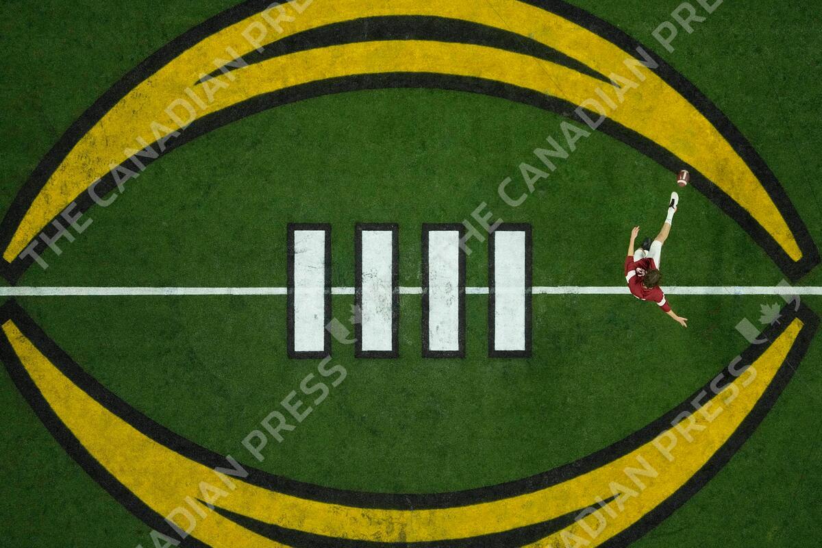 FILE - Alabama's James Burnip warms up before the College Football Playoff championship football game against Georgia on Jan. 10, 2022, in Indianapolis. The university presidents who oversee the College Football Playoff are scheduled to meet Friday, Sept. 2, 2022, to discuss expanding the four-team format, re-opening the possibility that a new model for crowning a champion could be implemented as soon as the 2024 season. (AP Photo/Charlie Riedel, File)