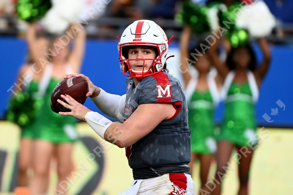 FILE -Miami (Ohio) quarterback Brett Gabbert looks for a receiver during the second half of the team's Frisco Football Classic NCAA college football game against North Texas in Frisco, Texas, Thursday, Dec. 23, 2021. Miami (Ohio) plays against Kentucky on Saturday, Sept. 3, 2022. (AP Photo/Matt Strasen, File)
