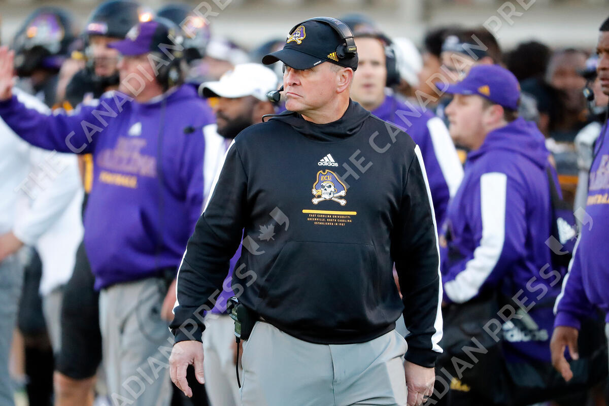 FILE - East Carolina head coach Mike Houston watches from the sideline during the first half of an NCAA college football game against Cincinnati in Greenville, N.C., Friday, Nov. 26, 2021. East Carolina will host No. 13 North Carolina State on Saturday to open the season. (AP Photo/Karl B DeBlaker, File)