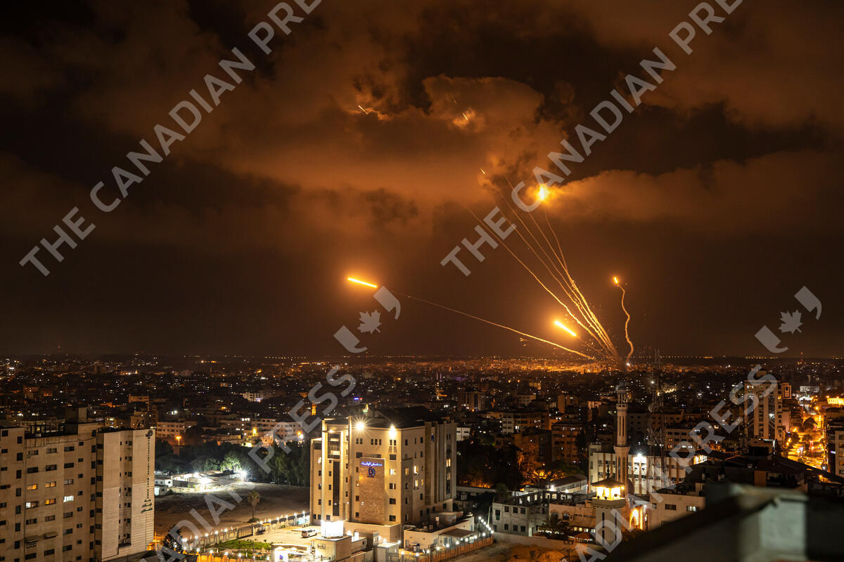 Rockets fired by Palestinian militants toward Israel, in Gaza City, Friday, Aug. 5, 2022. Palestinian officials say Israeli airstrikes on Gaza have killed at least 10 people, including a senior militant, and wounded 55 others. (AP Photo/Fatima Shbair)
