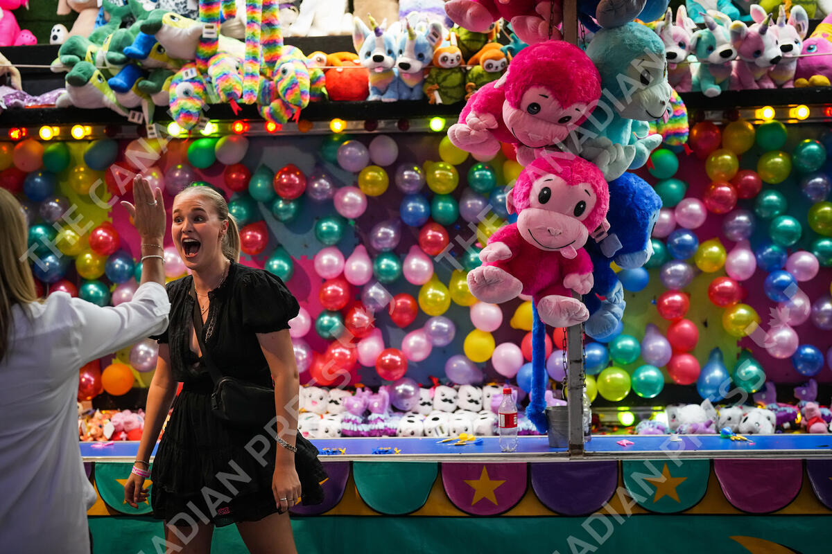 A woman reacts after popping a balloon with a dart and winning a prize at a carnival game during the Pacific National Exhibition Fair, in Vancouver, on Thursday, September 1, 2022. The 15-day event, which runs through Sept. 5, is the PNE's first full scale fair since prior to the start of the COVID-19 pandemic. The federal government announced this week that $10 million in funding for facility and infrastructure upgrades will be provided to the Pacific National Exhibition. THE CANADIAN PRESS/Darryl Dyck