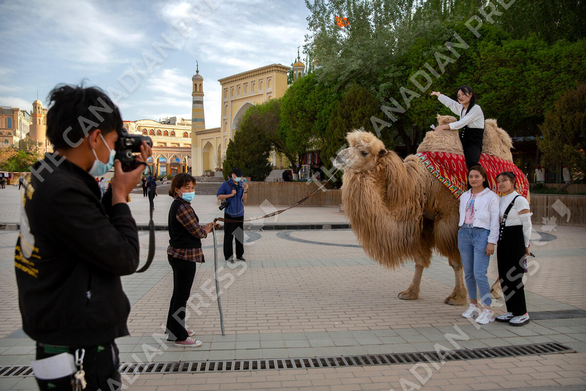FILE - Tourists pose for photos with a camel outside the Id Kah Mosque in Kashgar in western China's Xinjiang Uyghur Autonomous Region, as seen during a government organized trip for foreign journalists, on April 19, 2021. After a U.N. report concluding that China's crackdown in the far west Xinjiang region may constitute crimes against humanity, China used a well-worn tactic to deflect criticism: blame a Western conspiracy. (AP Photo/Mark Schiefelbein, File)