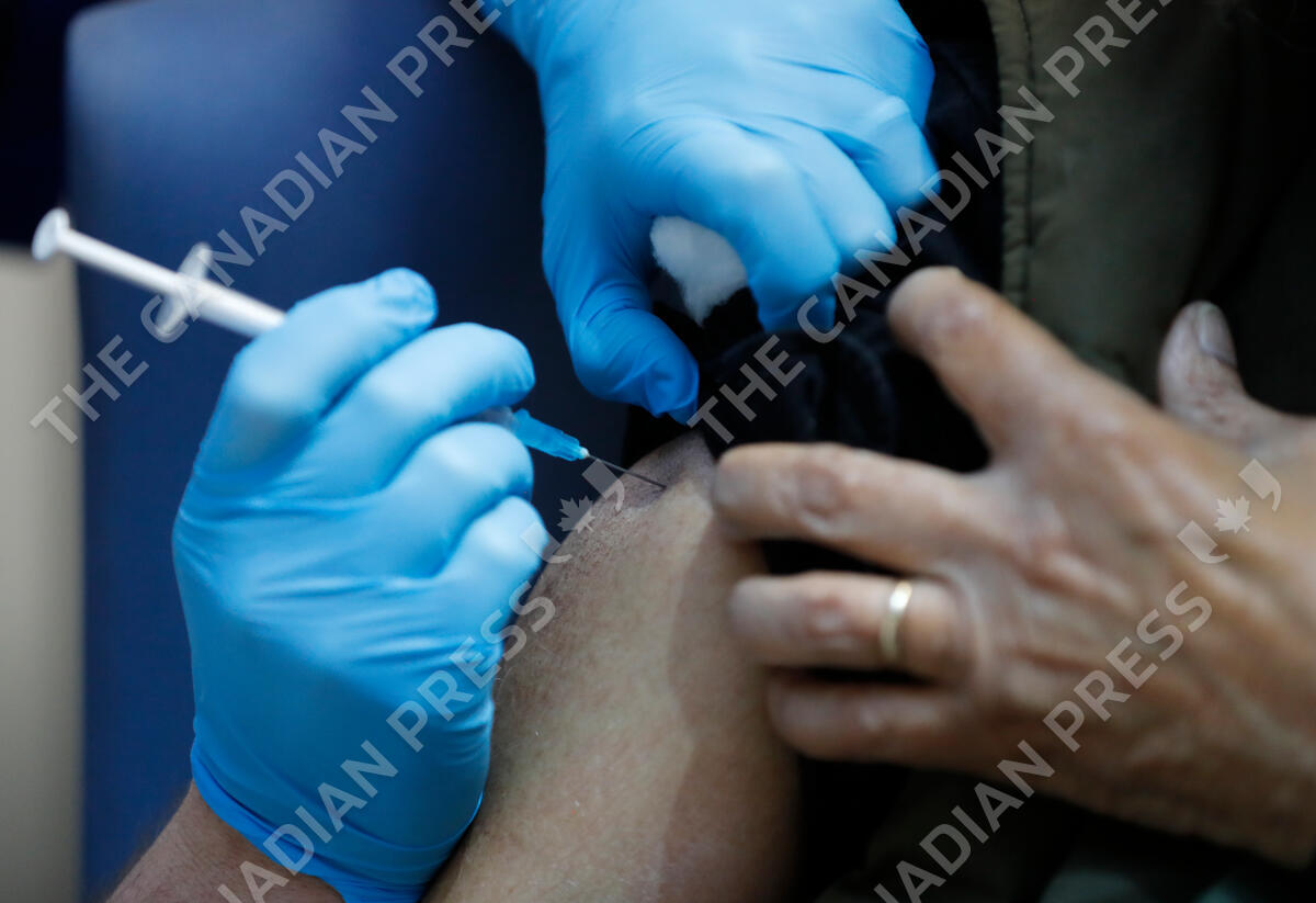 FILE - A nurse administers the Pfizer-BioNTech COVID-19 vaccine at Guy's Hospital in London, Tuesday, Dec. 8, 2020. On Friday, Sept. 2, 2022, The Associated Press reported on stories circulating online incorrectly claiming The U.K. government recently changed its COVID-19 vaccine guidance to advise against Pfizer’s shot for pregnant and breastfeeding people.(AP Photo/Frank Augstein, Pool)