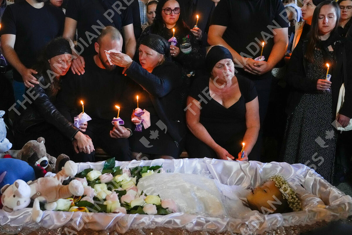 Relatives and friends pay their final respects to 4-year-old Liza Dmytrieva, who was killed by a Russian missile strike, during a ceremony in Vinnytsia, Ukraine, Sunday, July 17, 2022. (AP Photo/Efrem Lukatsky)