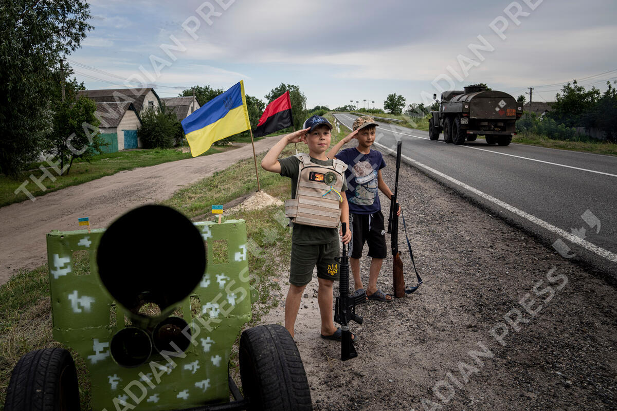 Maksym and Andrii, both 11, holding toy guns, salute a convoy of Ukrainian soldiers at a checkpoint constructed by residents along a highway in the Kharkiv region, Ukraine, Wednesday, July 20, 2022. (AP Photo/Evgeniy Maloletka)