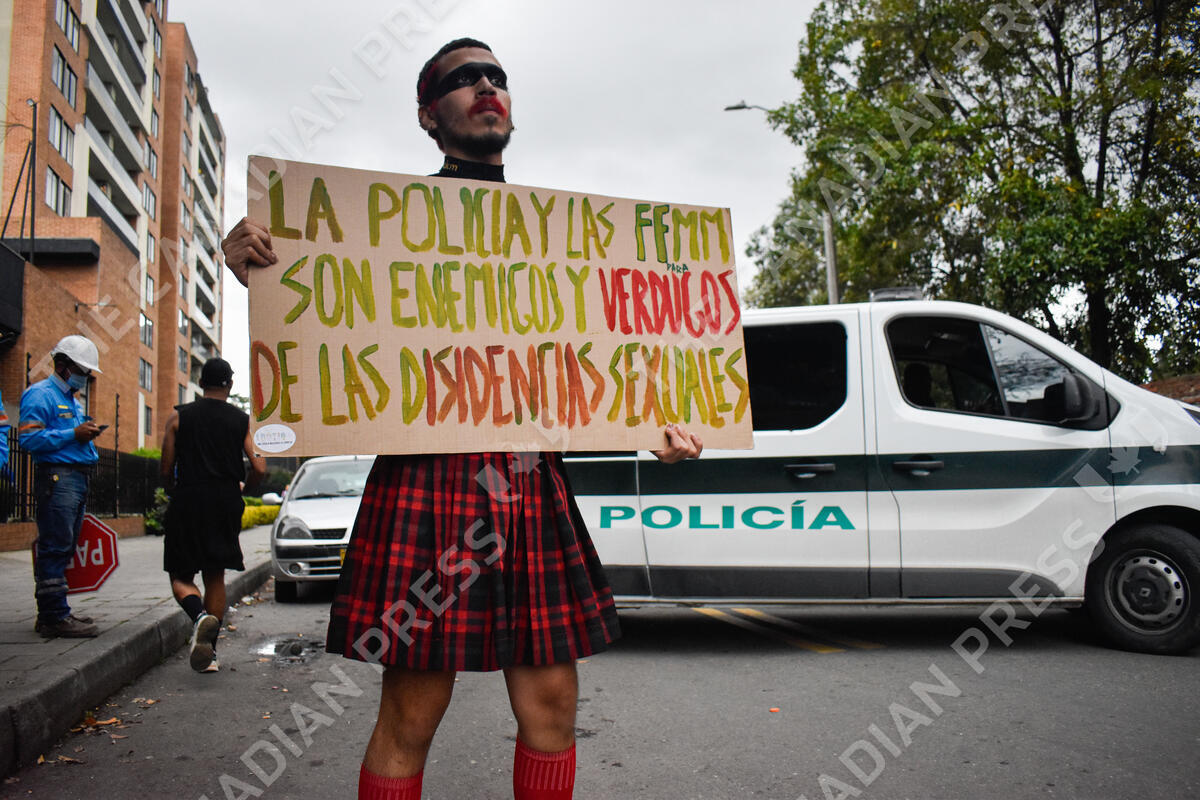 A demonstrator holds a sign against violent gender based acts against LGTBIQ+ Communities by police and military forces during a LGTBIQ+ rights protest in Bogota, Colombia, after a video of a group of people attacked a gay couple in a public park, on July 31, 2022. Photo by: Cristian Bayona/Long Visual Press/ABACAPRESS.COM