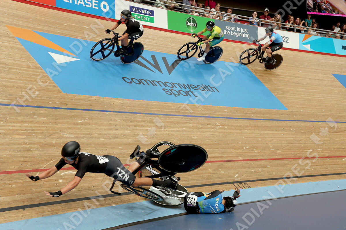 Bryony Botha of New Zealand, left, tumbles over Meenakshi Meenakshi of India as they crash during the women's 10km scratch race final during the Commonwealth Games track cycling at Lee Valley VeloPark in London, Monday, Aug. 1, 2022. (AP Photo/Ian Walton)