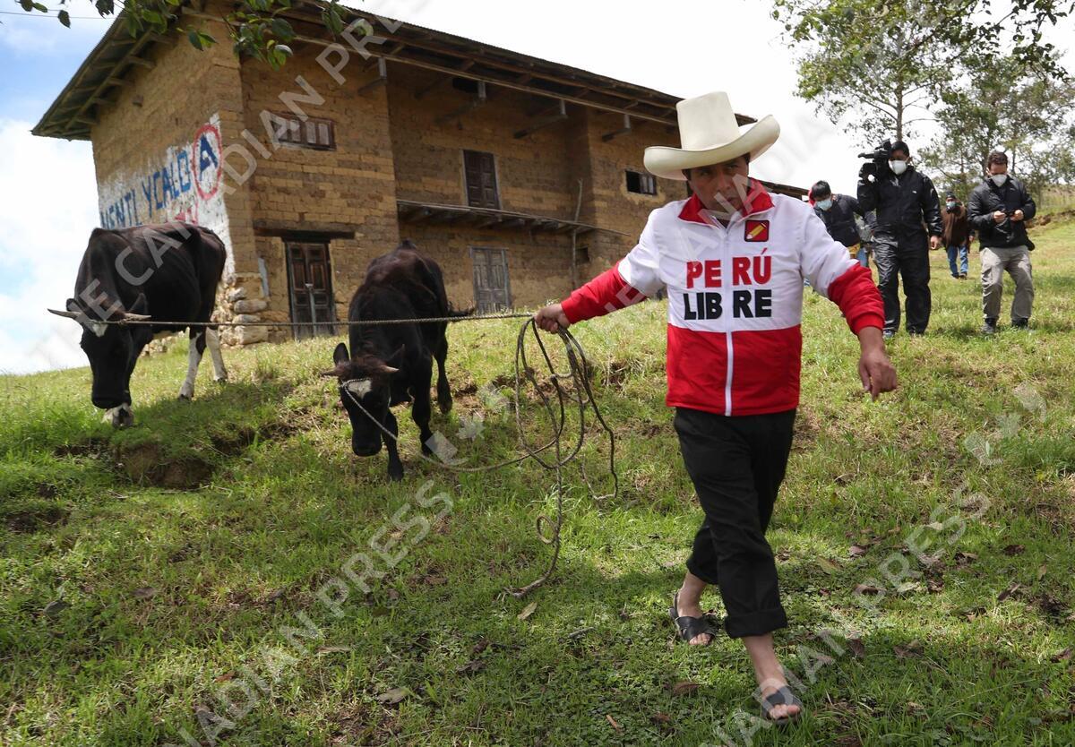 FILE - Then presidential candidate Pedro Castillo leads his cows for feeding as journalists follow, in Chugur, Peru, April 15, 2021. Castillo’s election in 2021 brought hopes for change in Peru’s unstable and corrupt political system, but the impoverished rural teacher and political neophyte has found himself engulfed in impeachment votes and corruption allegations. (AP Photo/Martin Mejia, File)