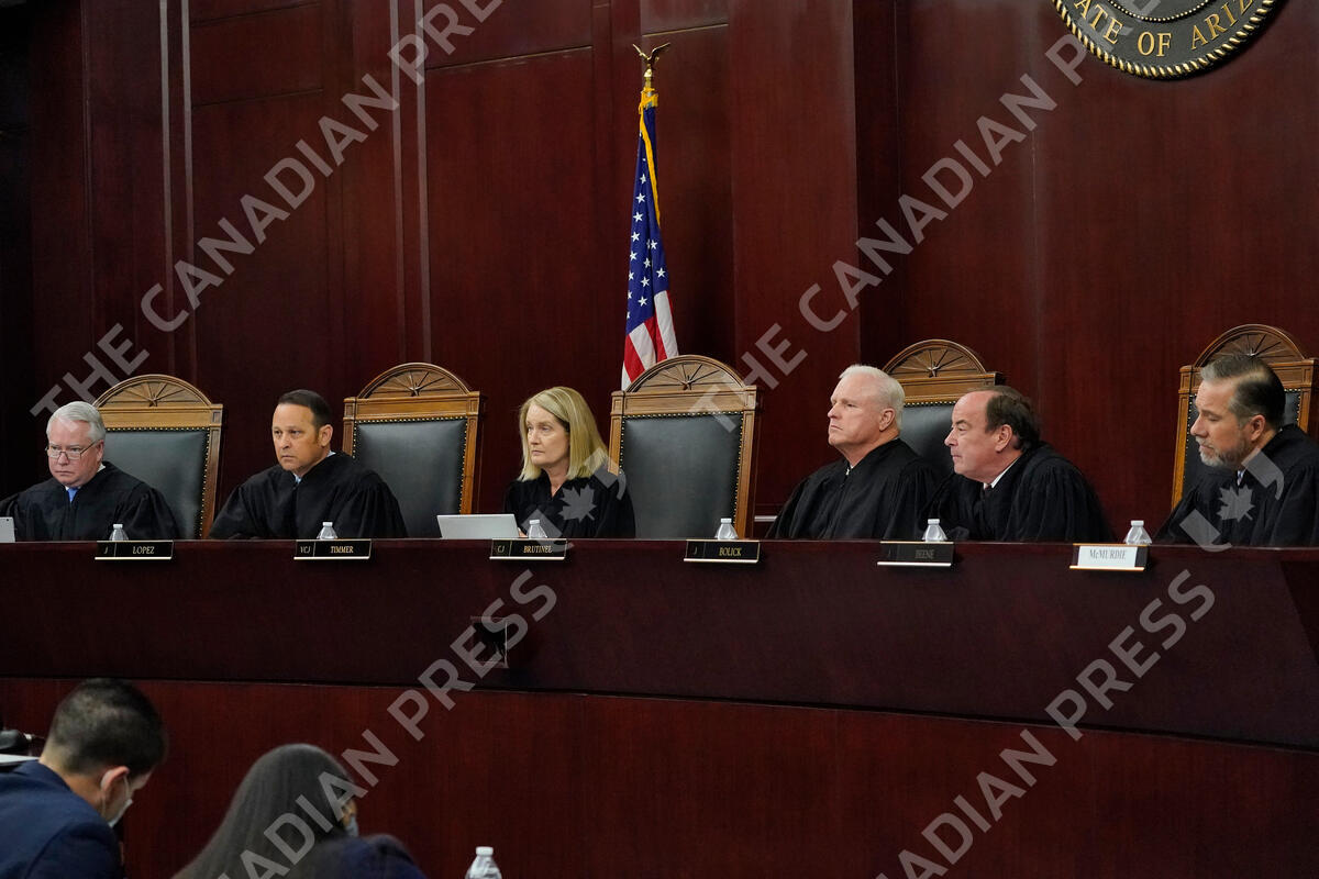 FILE - Arizona Supreme Court Justices from left; William G. Montgomery, John R Lopez IV, Vice Chief Justice Ann A. Scott Timmer, Chief Justice Robert M. Brutinel, Clint Bolick and James Beene listen to oral arguments on April 20, 2021, in Phoenix. Republican-dominated courts and legislatures have been pushing back against citizen-led ballot initiatives to keep them off the ballot, in what critics say is a partisan attack on direct democracy. (AP Photo/Matt York, File)
