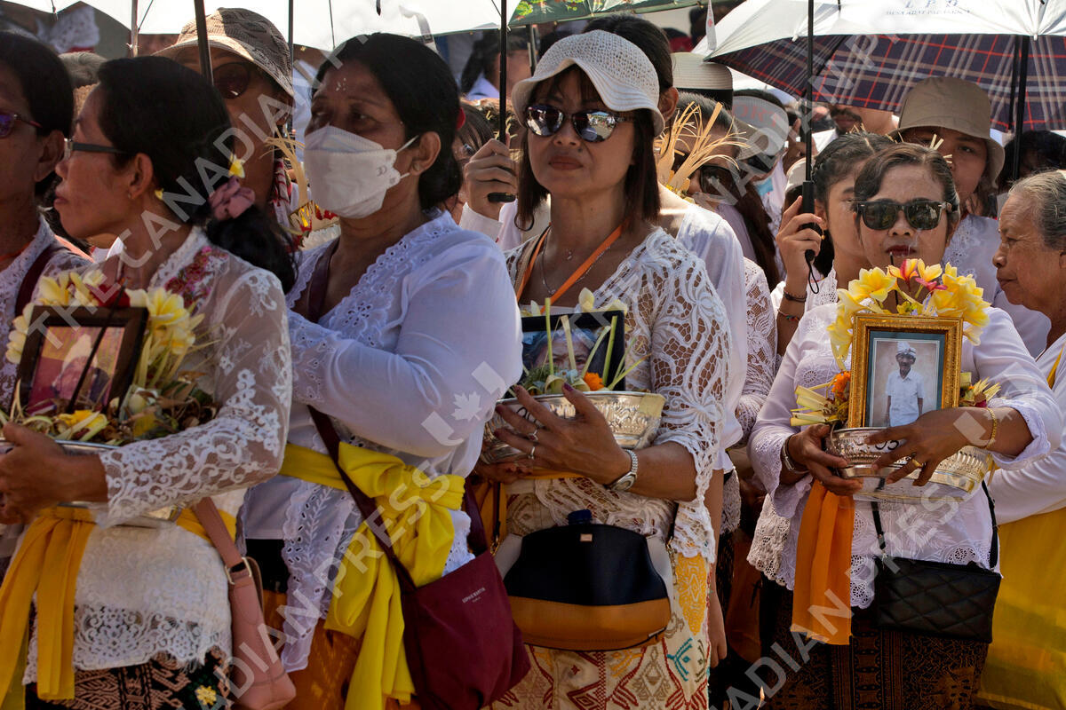 Balinese women carry photographs of relatives whose remains will be cremated in a traditional mass cremation ceremony called "ngaben" on Friday, July 29, 2022, in Padangbai on the island of Bali, Indonesia. The previously buried remains were dug up and placed in a temporary shrine before being cremated. Balinese believe that cremating the dead liberates their souls, allowing them to enter the higher world to reincarnate into better beings. (AP Photo/Firdia Lisnawati)