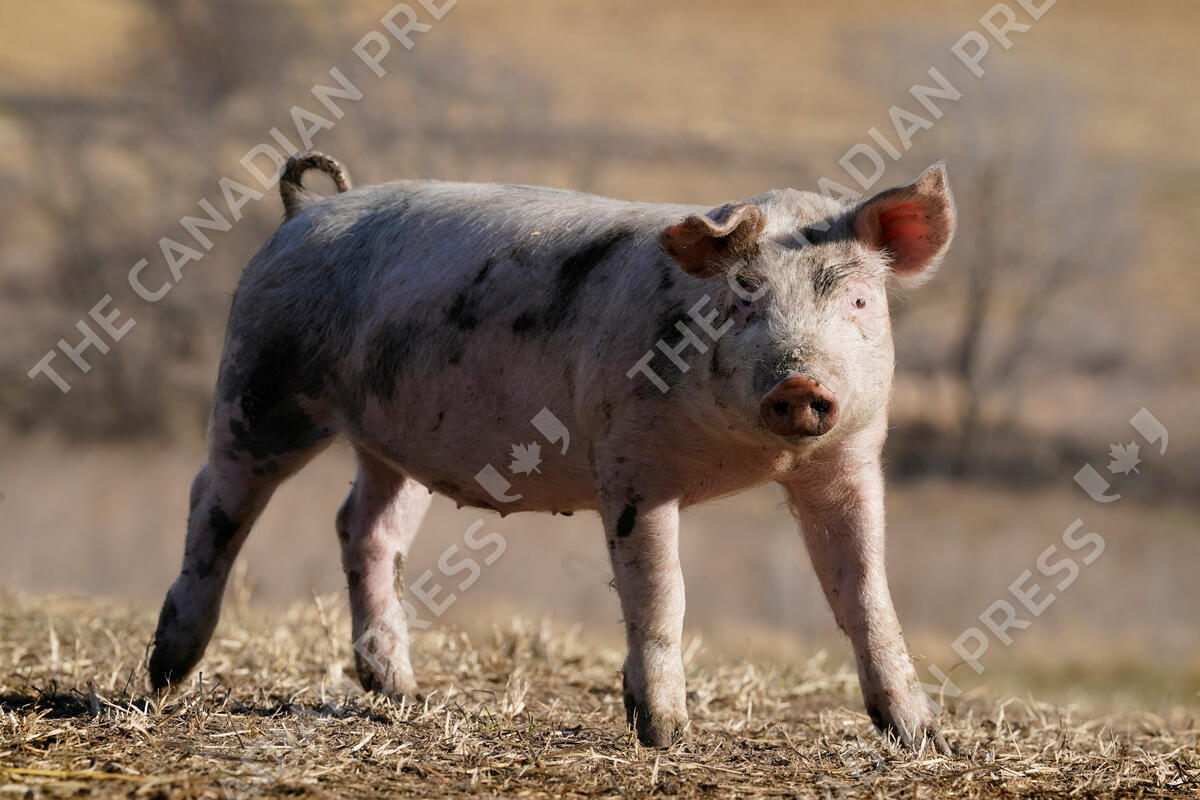 In this Dec. 2, 2021, photo a hog walks in a pasture on a farm near Elliott, Iowa. Hog farmers that already comply with a California animal welfare law approved by voters in 2018 stand to benefit when the regulations are implemented. But it's unclear if that will ever happen. The law should have taken effect in January, but the state has yet to fully write and approve the necessary regulations, and a state judge delayed enforcement because of that. Then the U.S. Supreme Court agreed to hear a case brought by a national pork industry group that opposes the regulations. (AP Photo/Charlie Neibergall, File)