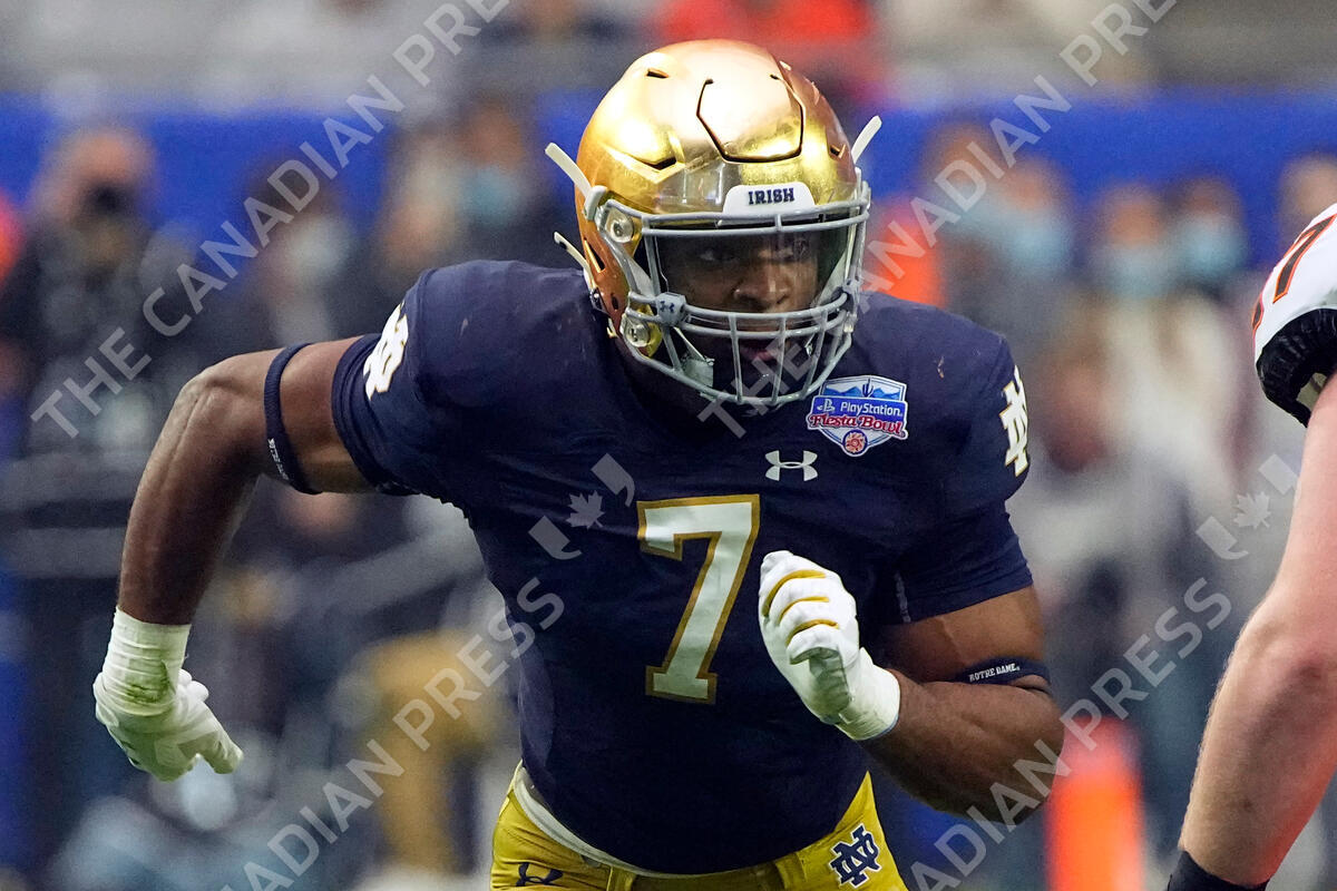 FILE - Notre Dame defensive lineman Isaiah Foskey (7) plays during the second half of the Fiesta Bowl NCAA college football game against Oklahoma State, Saturday, Jan. 1, 2022, in Glendale, Ariz. Foskey was named to the Associated Press preseason All-America team, Monday, Aug. 22, 2022. (AP Photo/Rick Scuteri, File)
