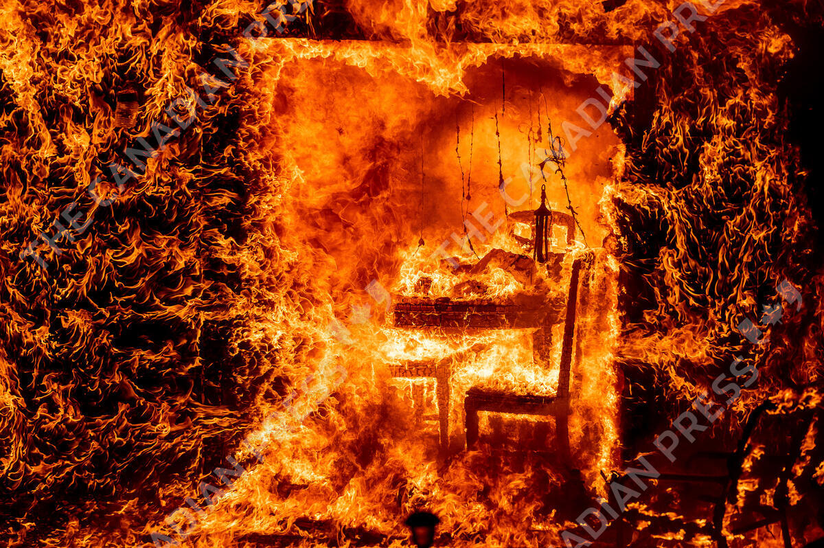 Flames engulf a chair inside a burning home as the Oak Fire burns in Mariposa County, Calif., on Saturday, July 23, 2022. (AP Photo/Noah Berger)