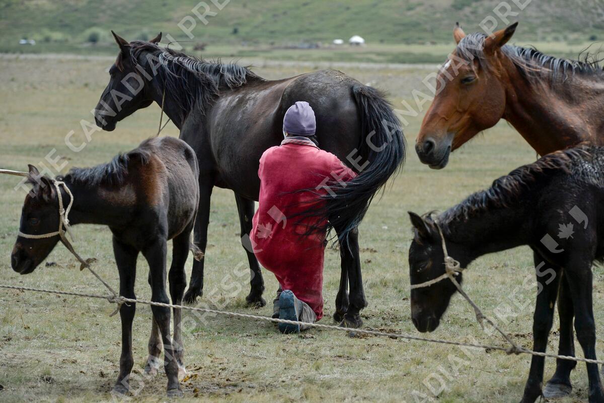 A Kyrgyz woman milks a horse in a mountain pasture in the Suusamyr Valley lies at 2500 meters above sea level in Kyrgyzstan's Tian Shan mountains 170 kilometres (100 miles) south of the capital Bishkek, Wednesday, Aug. 10, 2022. The milk is used to make kumis, a fermented drink popular in Central Asia that proponents say has health benefits. The grass and herbs lend flavor to the milk that locals draw from the mares in the fields where they graze. The milk then is left to ferment, or sometimes churned to promote fermentation, until it becomes mildly alcoholic.(AP Photo/Vladimir Voronin)