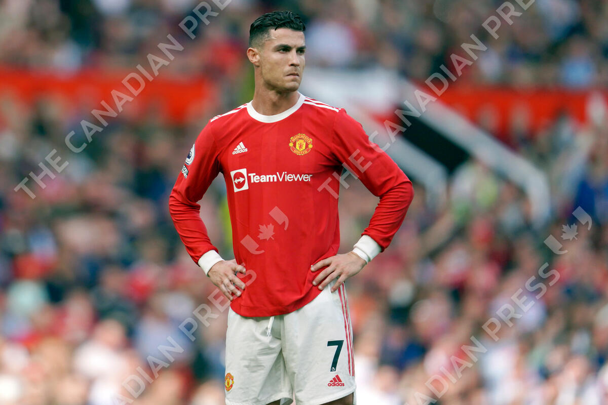 FILE - Manchester United's Cristiano Ronaldo stands on the pitch during the English Premier League soccer match between Manchester United and Norwich City at Old Trafford stadium in Manchester, England, on April 16, 2022. A Las Vegas police report compiled a decade after a woman first made a 2009 rape complaint against international soccer star Ronaldo almost became public by mistake on Tuesday, Aug. 30, 2022, before a Nevada judge backtracked and kept it sealed. (AP Photo/Jon Super, File)