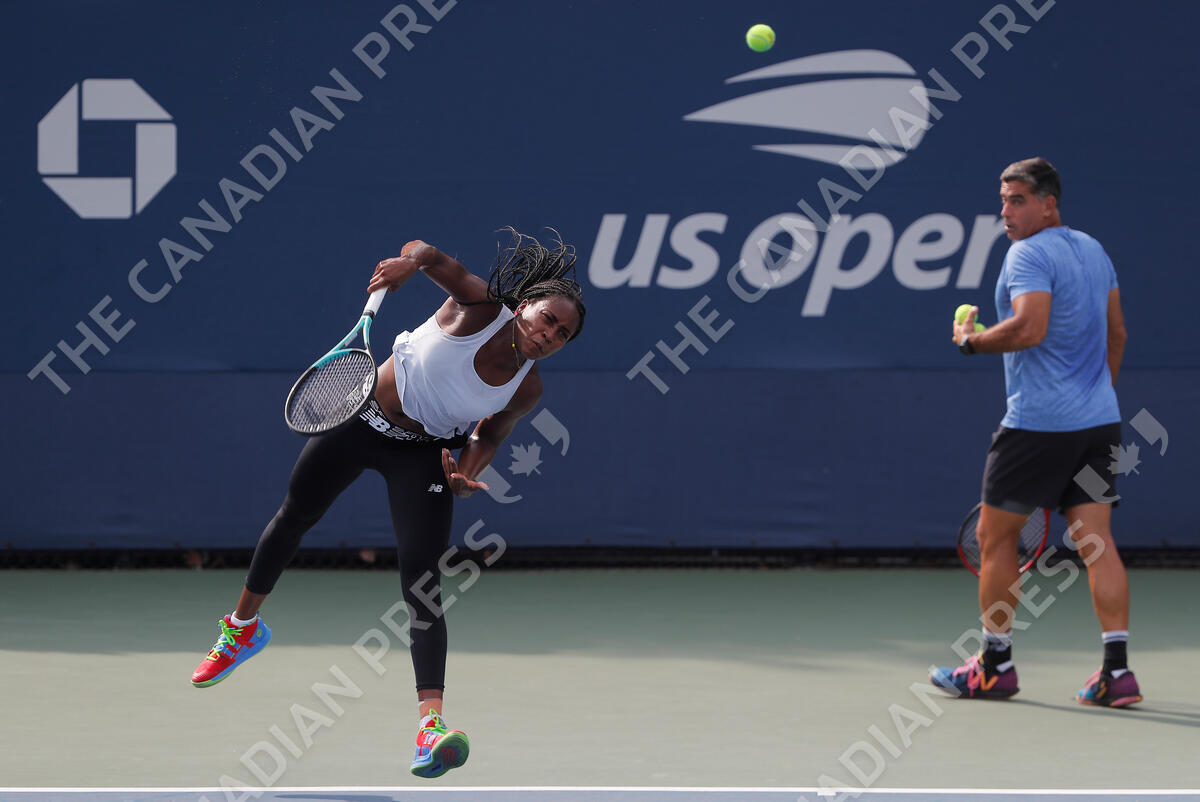 Coco Gauff serves during a practice session for the US Open tennis championships, Friday, March 26, 2022, in New York. (AP Photo/Julie Jacobson)
