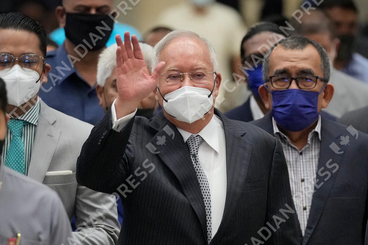 Former Malaysian Prime Minister Najib Razak, center, wearing a face mask, waves as he arrives at the Court of Appeal in Putrajaya, Malaysia, Tuesday, Aug. 23, 2022. Najib was sentenced to 12 years in jail by a high court in July 2020, after being found guilty of abuse of power, criminal breach of trust and money laundering for illegally receiving 42 million ringgit ($9.4 million) from SRC International, a former unit of 1MDB. (AP Photo/Vincent Thian)