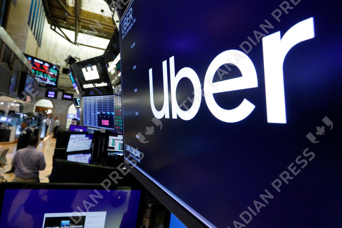 FILE - The logo for Uber appears above a trading post on the floor of the New York Stock Exchange, Friday, Aug. 9, 2019. Uber’s ride-hailing service continued to gain momentum in the second quarter as consumers headed back to offices and started traveling more amid an easing in pandemic restrictions. Passengers took a total of 1.87 billion trips on Uber during the spring and early summer, a 24% increase from the same time last year. (AP Photo/Richard Drew, File)