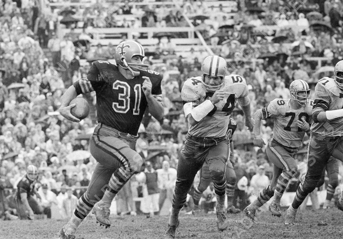FILE - New Orleans Saints' Jim Taylor (31) runs for a first down as Dallas Cowboys' Chuck Howley (54) pursues in the third quarter of an NFL football game in Dallas, Oct. 16, 1967. Also shown is Cowboys Ron East (79). Super Bowl MVP Chuck Howley and All-Pro defenders Joe Klecko and Ken Riley are finalists for the Pro Football Hall of Fame’s class of 2023. The defenders who starred in the 1960s, 70s and 80s were announced Wednesday, Aug. 17, 2022, as the three senior candidates for next year's Hall of Fame class from a list of 12 semifinalists. (AP Photo/Ferd Kaufman, File)