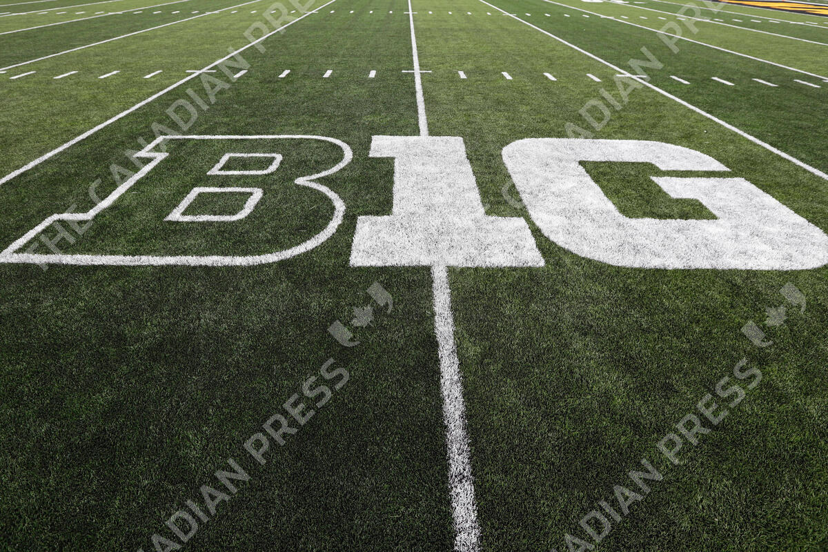 FILE - The Big Ten logo is displayed on the field before an NCAA college football game between Iowa and Miami of Ohio in Iowa City, Iowa., on Aug. 31, 2019. The Big Ten announced Thursday, Aug. 18, 2022, that it has reached seven-year agreements with Fox, CBS and NBC to share the rights to the conference's football and basketball games. (AP Photo/Charlie Neibergall, File)