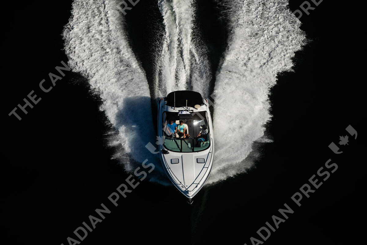 People riding in a small boat pass under the Lions Gate Bridge in Vancouver, on Sunday, August 14, 2022. THE CANADIAN PRESS/Darryl Dyck