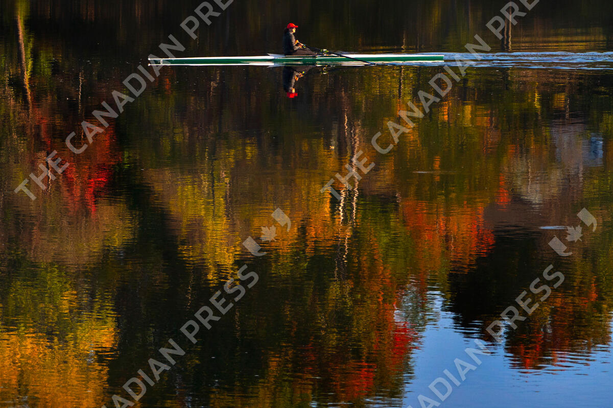 Rower Heather Rankin glides her single scull across placid water reflecting the changing colors of fall foliage on the Androscoggin River, Wednesday, Oct. 6, 2021, in Brunswick, Maine. (AP Photo/Robert F. Bukaty)