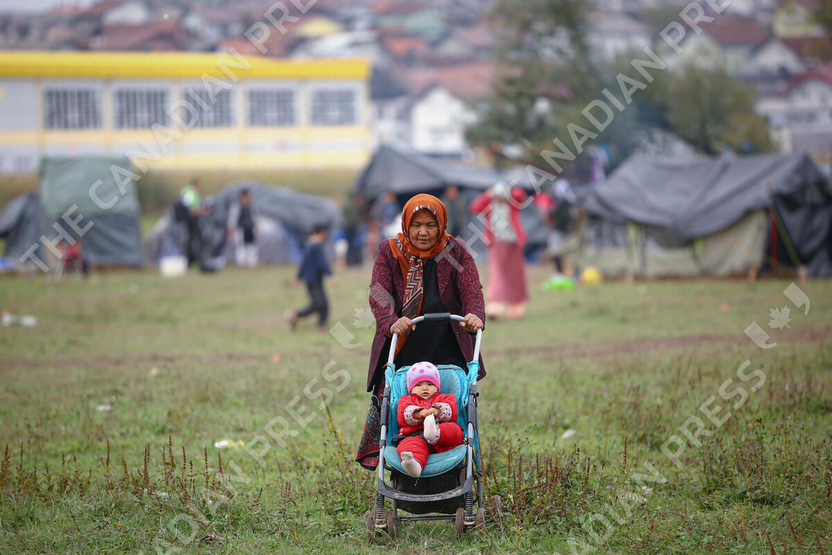 A migrant woman pushes a baby stroller at a makeshift camp housing migrants mostly from Afghanistan, in Velika Kladusa, Bosnia, Tuesday, Oct. 12, 2021. (AP Photo)