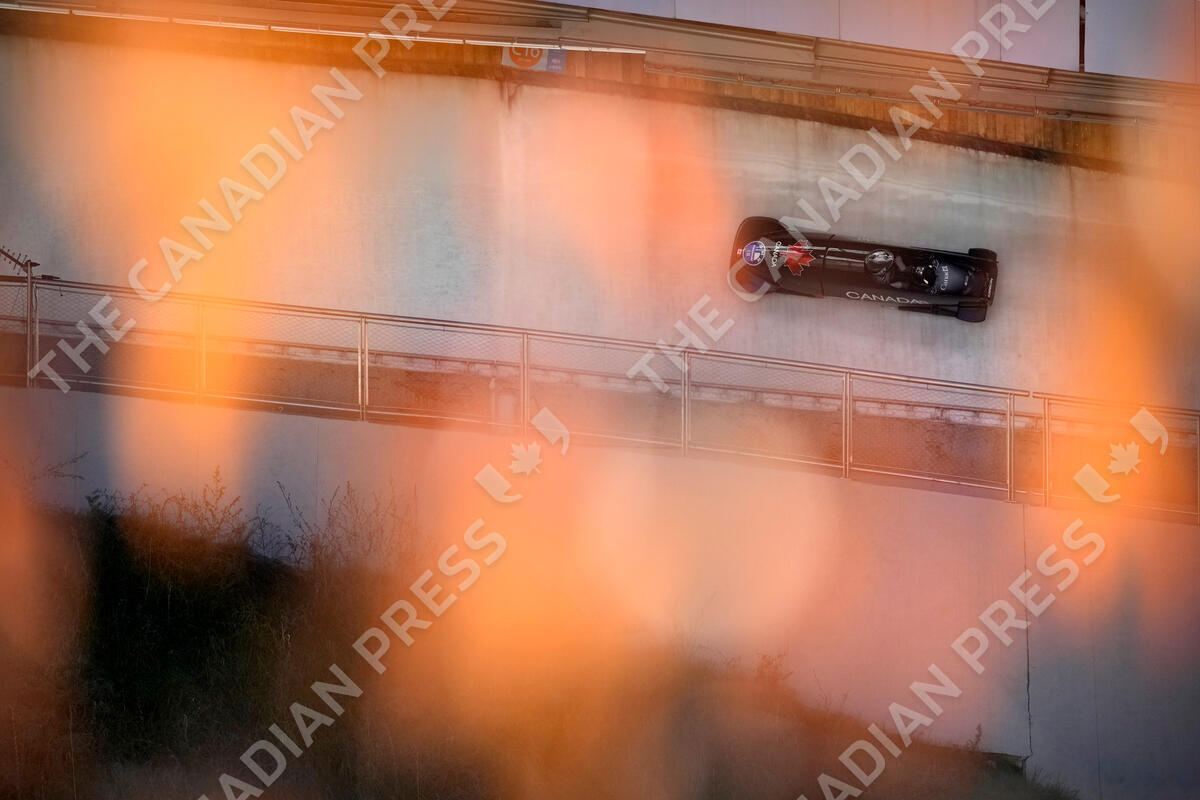 Cynthia Appiah and Dawn Richardson Wilson of Canada compete in the women's two-woman bobsleigh during an IBSF Sanctioned Race, a test event for the 2022 Winter Olympics, at the Yanqing National Sliding Center in Beijing, Tuesday, Oct. 26, 2021. (AP Photo/Mark Schiefelbein)