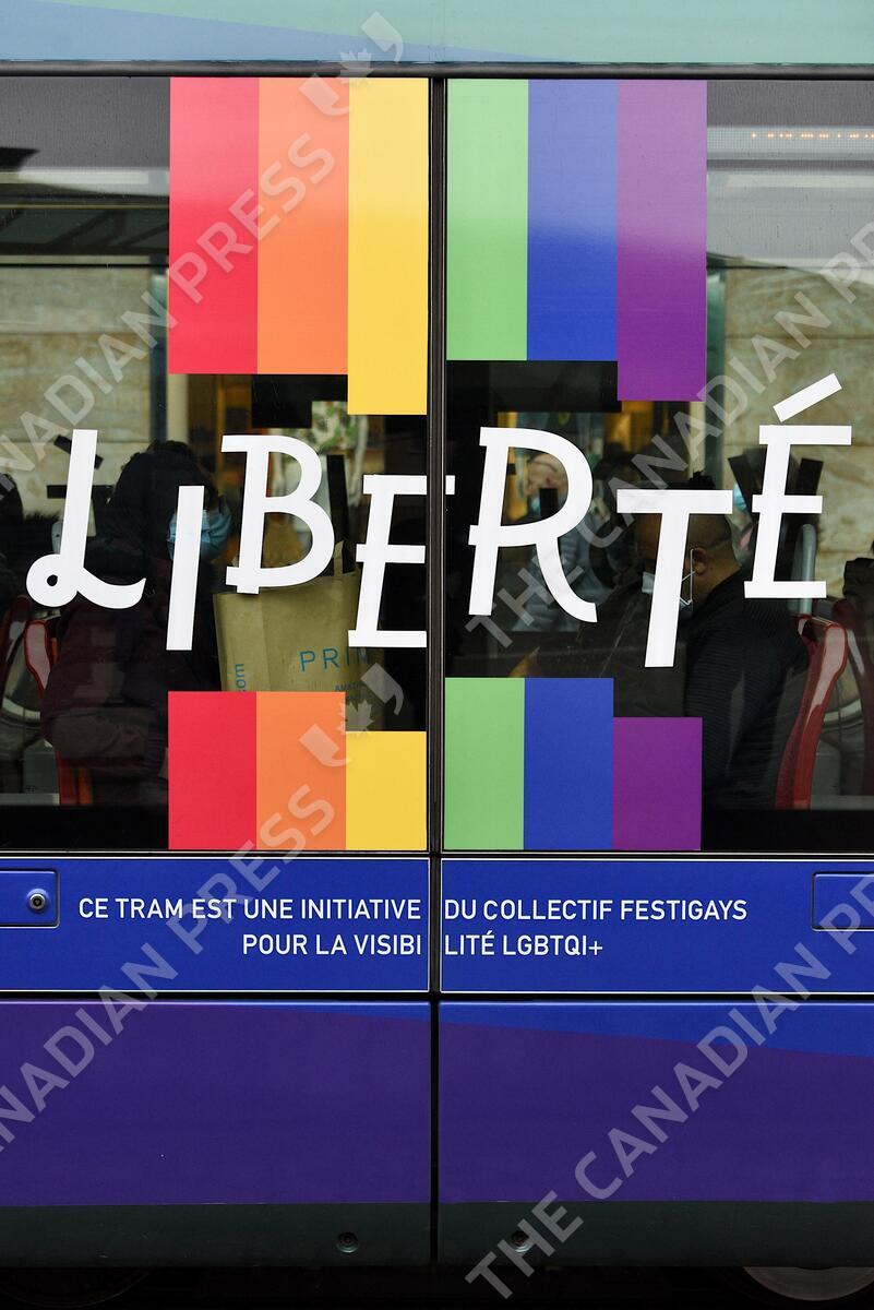 Awareness-raising campaign on discrimination and harassment as part of the LGBTQIA Visibility Month. A tram of the Compagnie des Transports Strasbourgeois (CTS) is repainted with the colours of the rainbow flag, and the word freedom. June 8, 2021, in Strasbourg, Northeastern France. Photo by Nicolas Roses/ABACAPRESS.COM