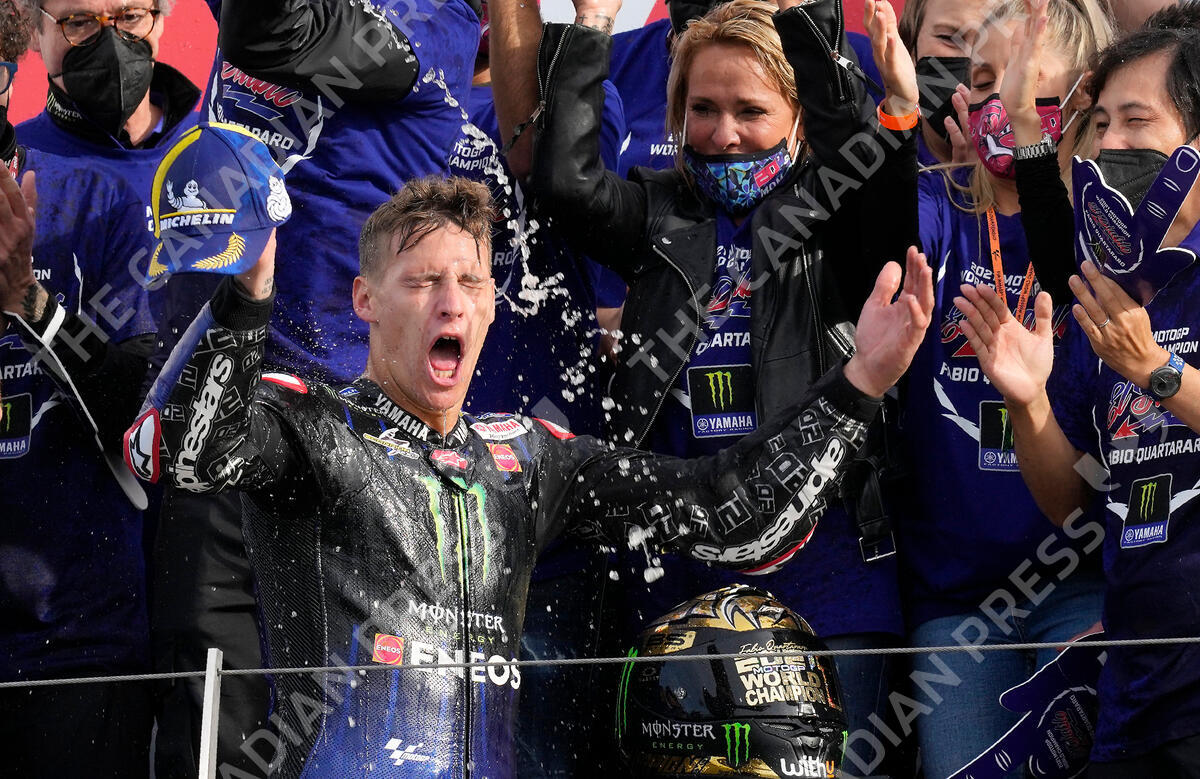 Moto GP World Champion France's rider Fabio Quartararo of the Monster Energy Yamaha MotoGP, front, celebrates on the podium with his team members after finishing fourth the MotoGP race of the Emilia Romagna Motorcycle Grand Prix at the Misano circuit in Misano Adriatico, Italy, Sunday, Oct. 24, 2021. (AP Photo/Antonio Calanni)