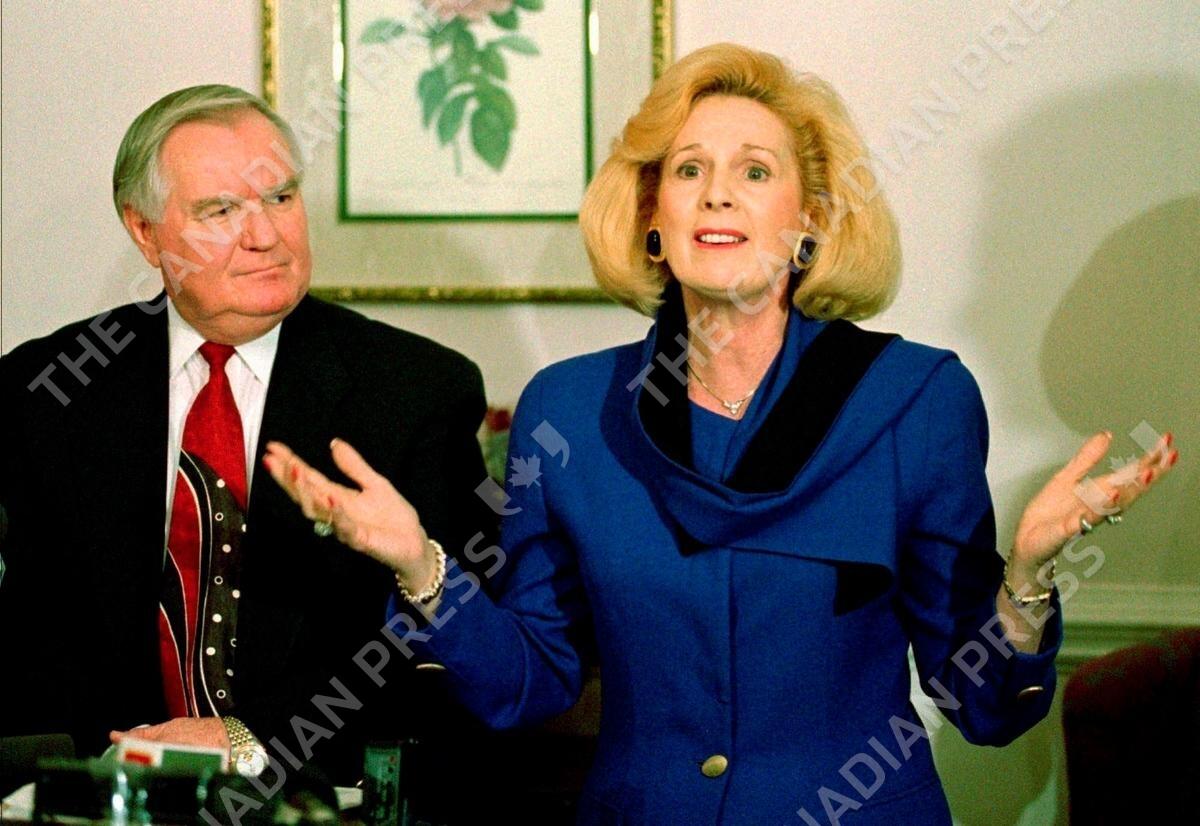 FILE - In this March 2, 1995 file photo, Word of Faith Fellowship church leader Jane Whaley talk to members of the media as husband Sam listens during a news conference in Spindale, N.C. Whaley has persuaded a magistrate to issue trespassing charges against Democratic candidate David Wheeler, who brought supporters and a TV crew along to a scheduled meeting at the church. Wheeler says he was invited by Whaley to visit the church, which has been accused of beating congregants to expel demons. Wheeler told The Associated Press that Whaley and other members invited him so he could see for himself that it is an open and loving church. (AP Photo/Chuck Burton, File)