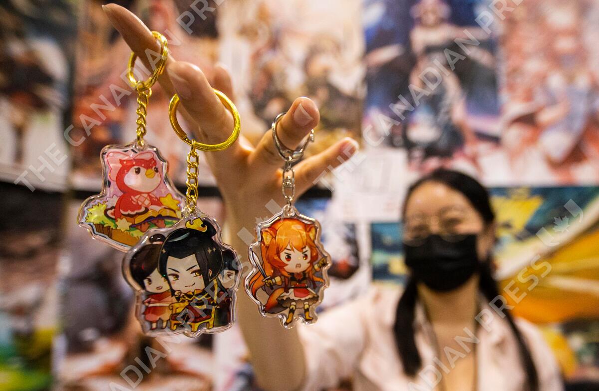 TORONTO, Oct. 23, 2021 An exhibitor shows animated character key chains during the 2021 Fan Expo Canada at the Metro Toronto Convention Center (MTCC) in Toronto, Canada, on Oct. 22, 2021. As one of the largest Comics, Sci-Fi, Anime and Gaming events in North America, this event is held here from Friday to Sunday. (Credit Image: © Zou Zheng/Xinhua via ZUMA Press)