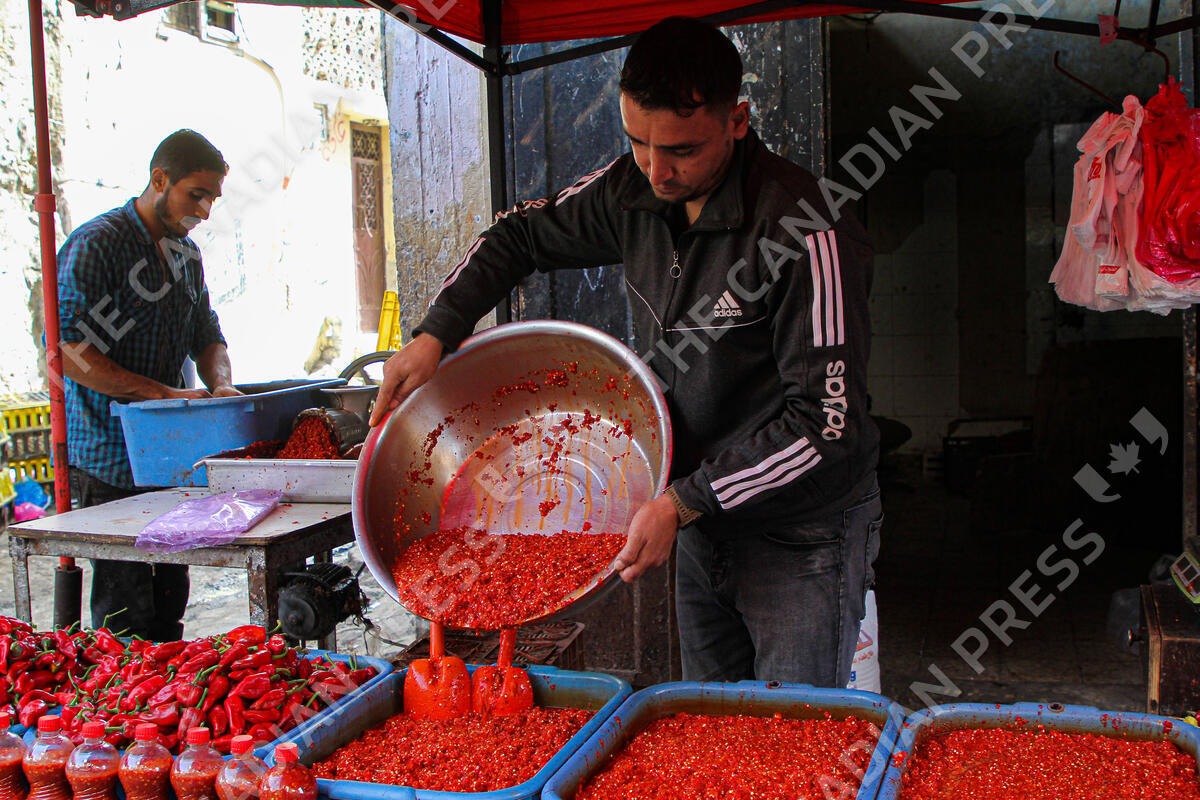 GAZA Gaza City, Oct. 27, 2021 Vendors prepare red chili paste at a market in Shujaya neighborhood, east of Gaza City, on Oct. 27, 2021. (Credit Image: © Rizek Abdeljawad/Xinhua via ZUMA Press)