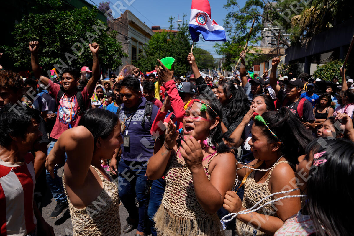Members of the Ava Guarani Indigenous people sing during a march to demand title to ancestral Indigenous lands and for the government to stop evicting Indigenous people in Asuncion, Paraguay, Tuesday, Oct. 12, 2021. (AP Photo/Jorge Saenz)