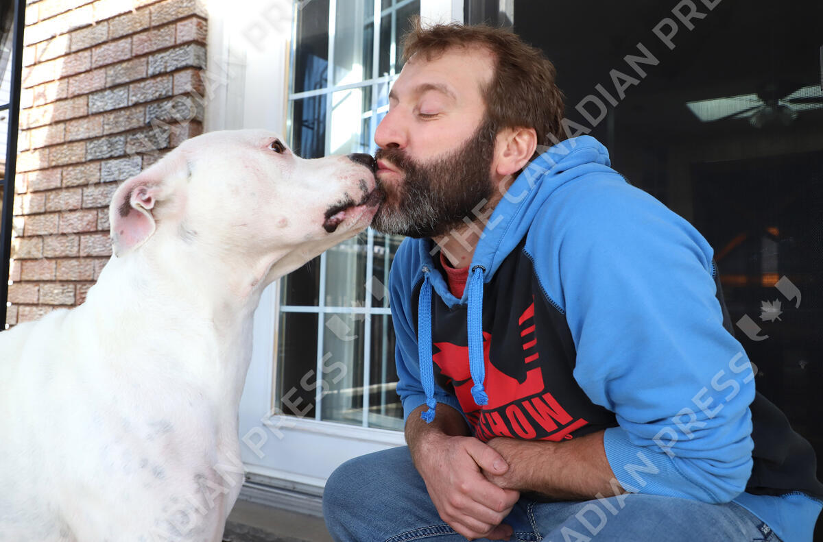 Kavin Joanette plays with his dog Messier at his home in Val Caron, Ont. on Wednesday, Sept. 29, 2021. Joanette was one of 39 miners trapped at Vale's Totten Mine. THE CANADIAN PRESS/Gino Donato