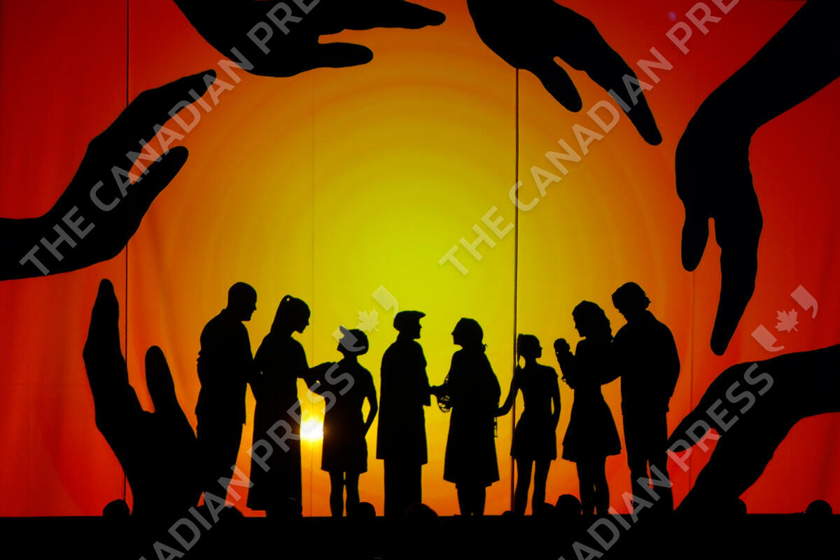 CAPTION CORRECTS COUNTRY Artists perform on stage during the 4th Budapest Demographic Summit in Budapest, Hungary, Thursday, Sept. 23, 2021. The biannual demographic summit, which was first organized in 2015, offers a forum for "pro-family thinker" decision-makers, scientists, researchers, and church representatives of the same sort to exchange their thoughts about connections between demographics and sustainability. (AP Photo/Laszlo Balogh)