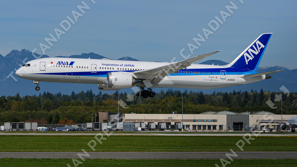 An ANA All Nippon Airways Boeing 787-9 Dreamliner jet (JA922A) lands at Vancouver International Airport, Richmond, B.C. on Friday, September 24, 2021. THE CANADIAN PRESS IMAGES/Bayne Stanley