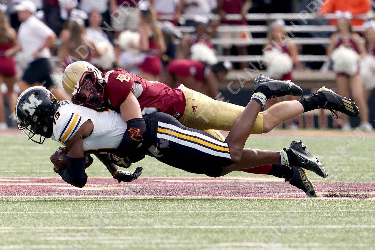 Missouri wide receiver JJ Hester (13) is wrapped up by Boston College defensive back Mike Palmer (18) after making a catch during the second half of an NCAA college football game, Saturday, Sept. 25, 2021, in Boston. (AP Photo/Mary Schwalm)