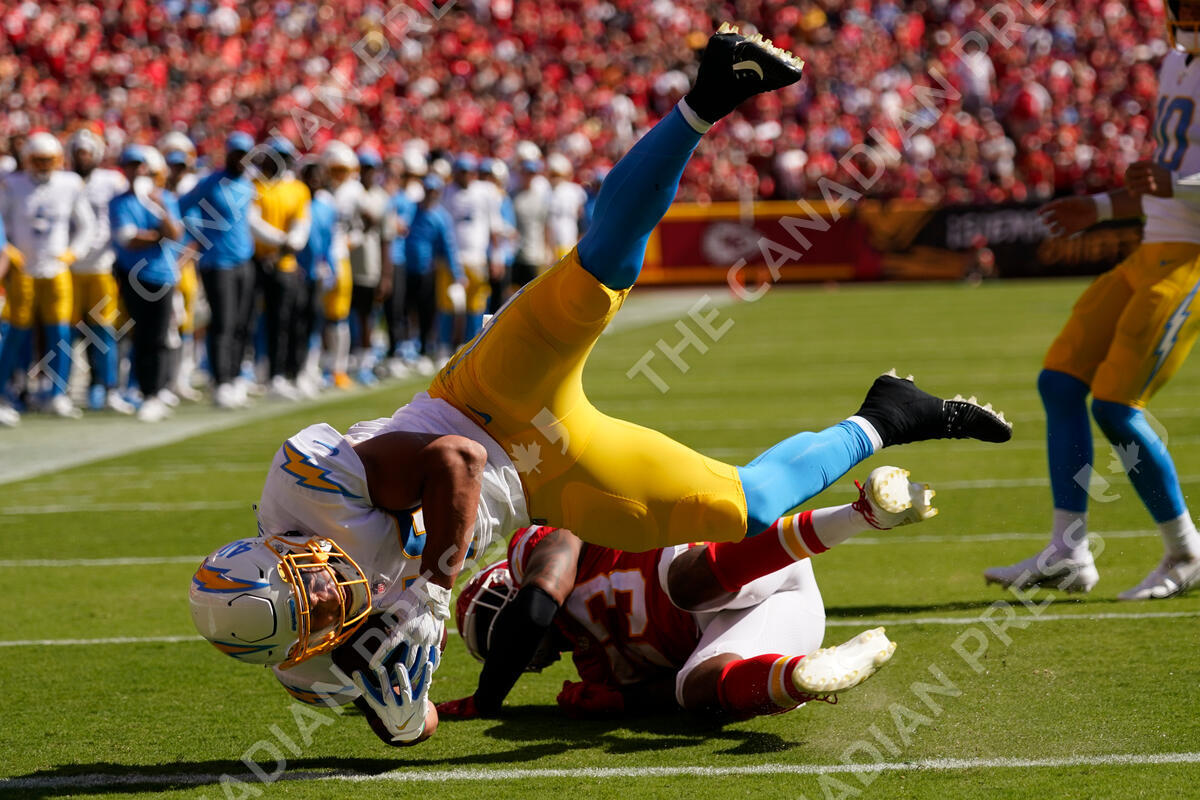 Los Angeles Chargers' Gabe Nabers (40) is tackled by Kansas City Chiefs' Anthony Hitchens during the second half of an NFL football game, Sunday, Sept. 26, 2021, in Kansas City, Mo. The play was called back due to a penalty (AP Photo/Charlie Riedel)