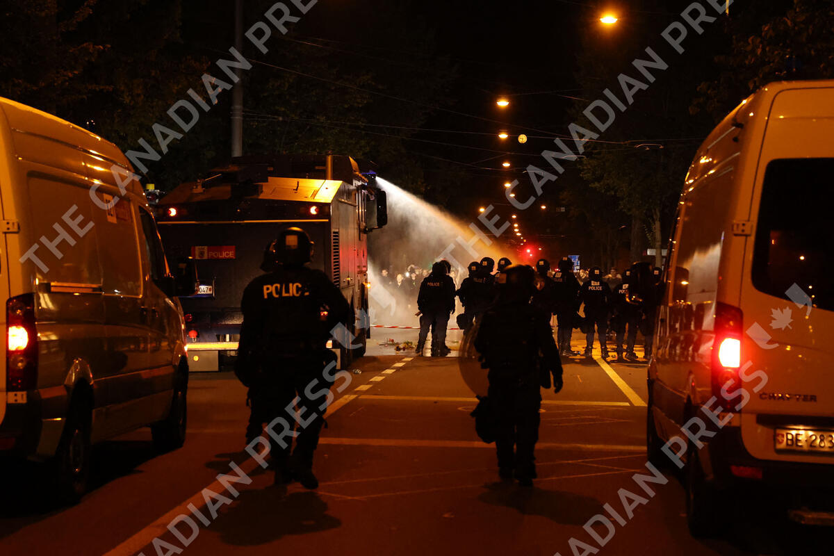 The federal capital Bern experienced another turbulent evening on Thursday. Several thousand people defied a ban on demonstrations by the authorities to voice their opposition to the anti-Covid measures. The Bundesplatz in front of the Swiss parliament, completely blocked by the security forces. Switzerland Bern, September 23 2021. Photo by Francois Glories/ABACAPRESS.COM