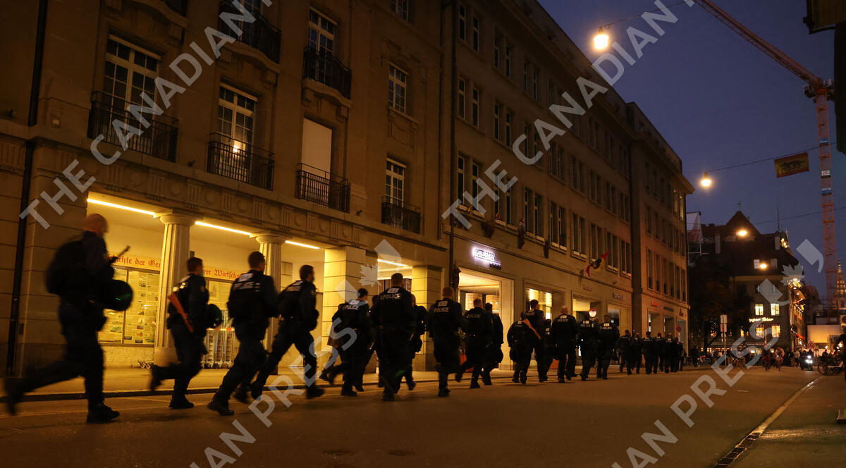 The federal capital Bern experienced another turbulent evening on Thursday. Several thousand people defied a ban on demonstrations by the authorities to voice their opposition to the anti-Covid measures. The Bundesplatz in front of the Swiss parliament, completely blocked by the security forces. Switzerland Bern, September 23 2021. Photo by Francois Glories/ABACAPRESS.COM