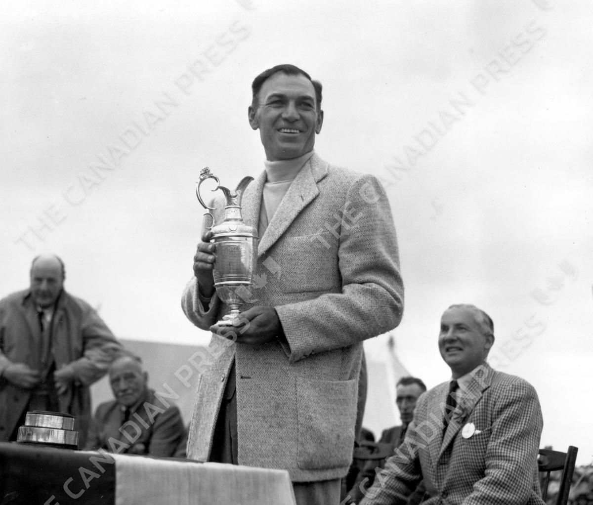 FILE - In this July 10, 1953, file photo, Ben Hogan holds his trophy after winning the British Open Golf Championship at Carnoustie, Scotland. Carnoustie is known more for the calamity it causes than the British Open champions it produces. That reputation is what awaits the world's best when the 147th edition of the British Open returns to what many consider the toughest links in the world. (AP Photo/Dennis Lee Royle, File)