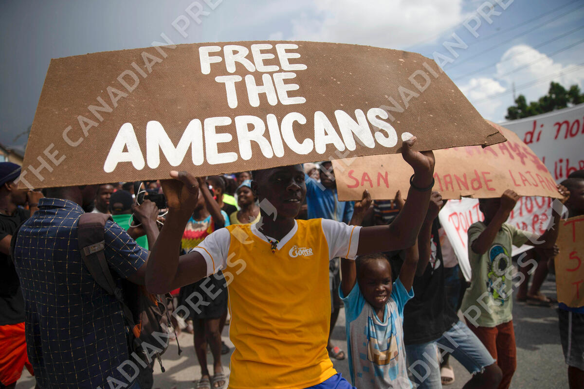 People protest for the release of kidnapped missionaries near the Ohio-based Christian Aid Ministries headquarters in Titanyen, north of Port-au-Prince, Haiti, Tuesday, Oct. 19, 2021. A group of 17 U.S. missionaries including children was kidnapped by a gang in Haiti on Saturday, Oct. 16, according to a voice message sent to various religious missions by an organization with direct knowledge of the incident. (AP Photo/Joseph Odelyn)
