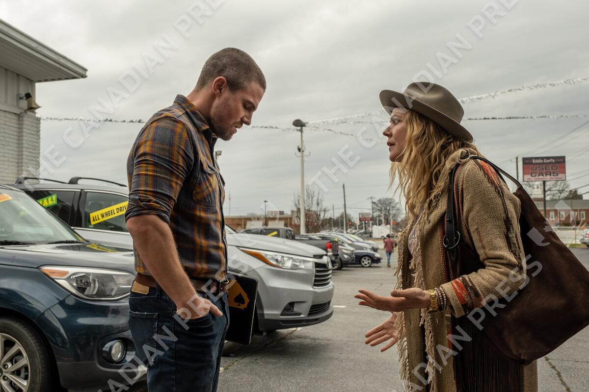 HEELS, from left: Stephen Amell, Mary McCormack, Cutting Promos', (Season 1, ep. 104, aired Sept. 5, 2021). photo: Mark Hill / ©Starz! / Courtesy Everett Collection