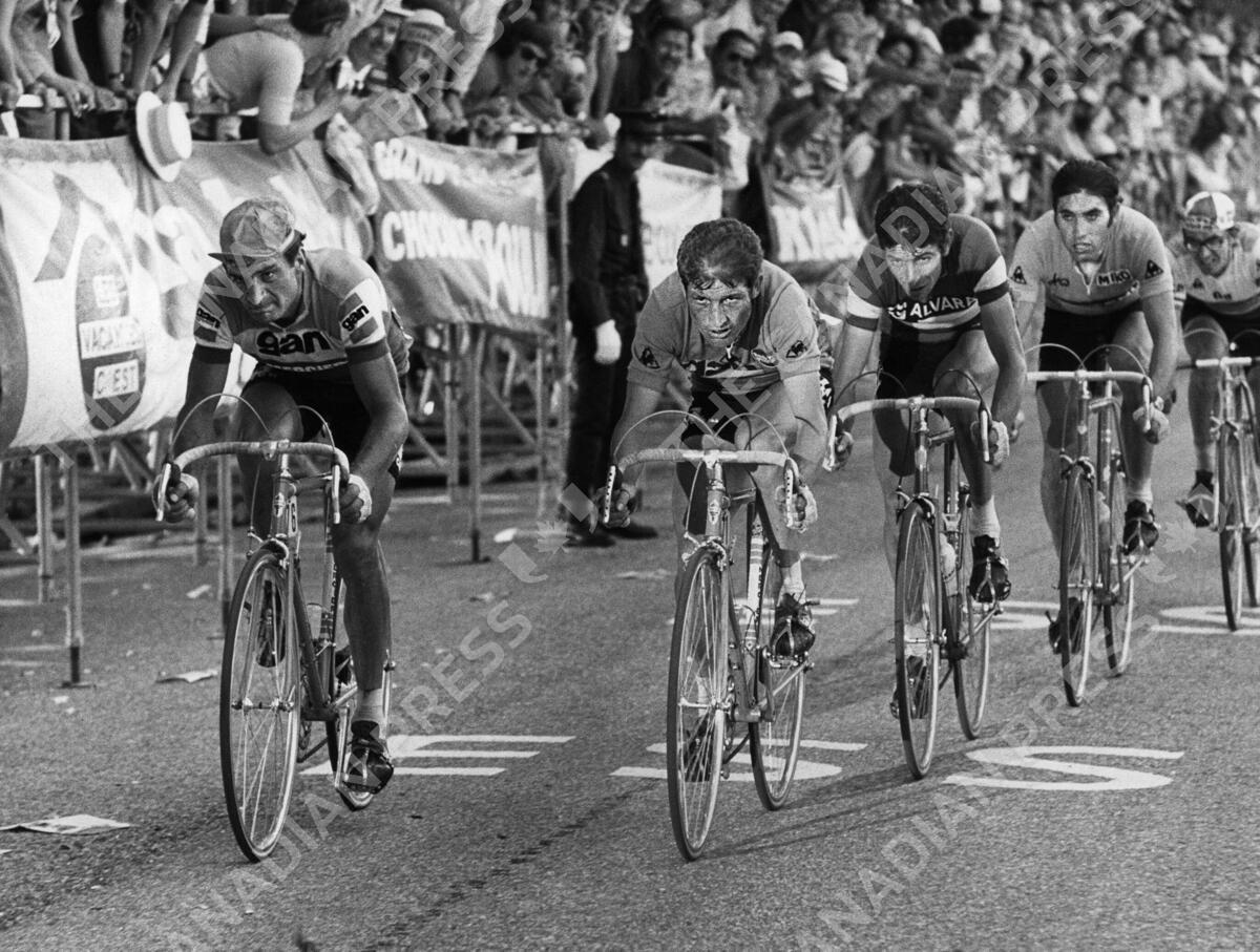 FILE - In this file photo dated July 18, 1972, Cyclists Raymond Poulidor of France, left, leads Cyrille Guimard of France, Felice Gimondi of Italy and Eddy Merckx of Belgium, during the 14 stage of the Tour de France cycling race from Valloire-Le Galibier to Aix les Bains. Grandson of Tour great Raymond Poulidor, debutant Mathieu van der Poel has snatched the race leader’s yellow jersey with a win in the second stage. Poulidor took part in 14 Tours from 1962-76 but never wore the yellow jersey, unlike his grandson. (AP Photo, File)