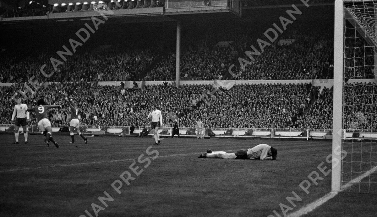 FILE - In this April 29, 1972 file photo England goalkeeper Gordon Banks, lies on the turf after being beaten for West Germany's first goal, scored by Uli Hoeness in the European Nations Soccer Cup quarter final, first leg at Wembley Stadium in London. (AP Photo/Paul Harris, File)