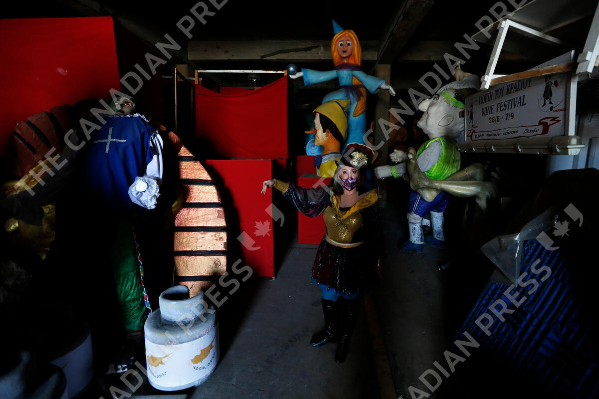 Skevi Antoniadou, a municipality official in charge of organizing Carnival festivities, wearing a face mask and carnival costume, walks inside a warehouse with stored carnival figures in the southern coastal city of Limassol, Cyprus, Thursday, March 4, 2021. The coronavirus pandemic has dampened celebrations this year. Yet Limassol's municipal authorities aren't letting the festive spirit completely wither away. A series of events conforming to coronavirus health protocols will culminate with the secret outing of King Carnival, the lead float that marks the year's Carnival theme. (AP Photo/Petros Karadjias)